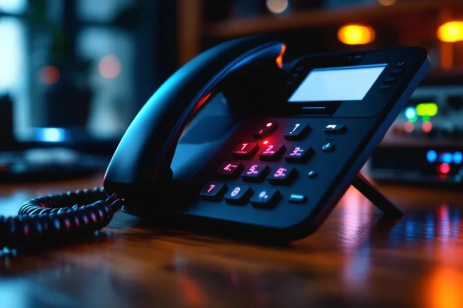 Zakelijke bureautelefoon met rood 'geen verbinding' lampje op houten bureau met netwerkapparatuur op achtergrond